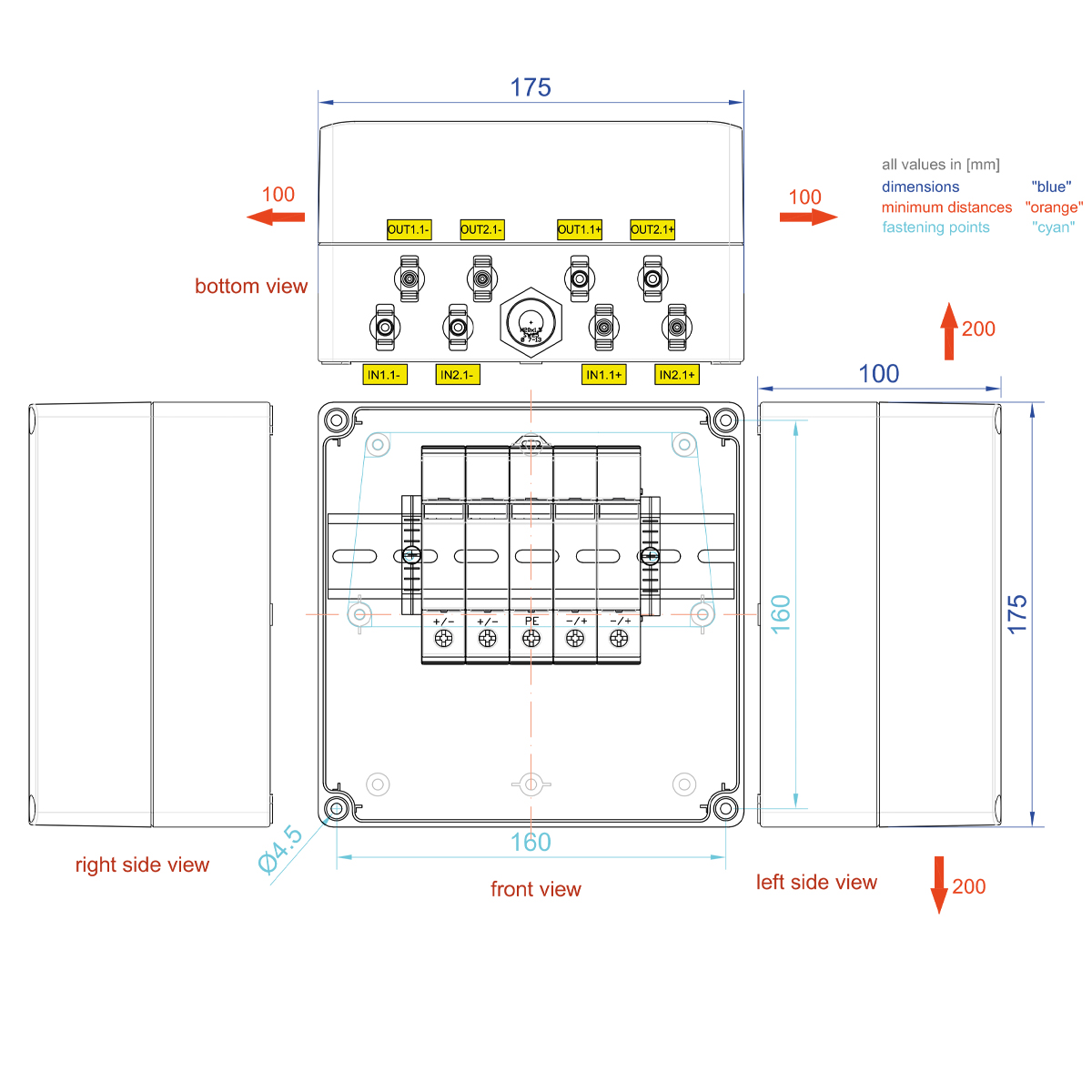 Bem.-Isolierspannung Ui [VDC]: 1000 Bem.-Betriebsspannung Ue [VDC]: 1000 Anzahl unabhängige MPP Eingänge [n]: 2 Anzahl Stränge pro MPP IN [n]: 1 Anzahl Stränge pro MPP OUT [n]: 1 Bemessungsstrom InA (=Summe Isc STC) [ADC]: 64 Auslegungsstrom* Isc max [ADC]: 80 (=Summe Isc STC x 1,25) PRO STRANG: Bemessungsstrom Inc (=Isc STC) [ADC]: 32 Auslegungsstrom* Isc max [ADC]: 40 (= Isc STC x 1,25) Umgebungstemperatur: -25°C - +35°C (kurzzeitig 40°C) Überspannungsschutz: Klasse I-II/ BC Sicherungshalter: - Sicherung: - Lasttrennstelle: - Eingang: MC4 Ausgang: MC4 Schutzklasse: II IP Schutzart: IP65 Konformität: IEC 61439-1/2 Art der Montage: Wandmontage Abmessungen:(BxHxT)mm 175 x 175 x 100 Gehäuse: Polycarbonat (PC) Gehäuse mit transparentem Schraubdeckel Montageart: Im Innenbereich oder im geschützten Außenbereich (KEINE direkte Bewitterung!) Einführungen 1x MC4-Paar am Eingang und 1x MC4-Paar am Ausgang bei jedem MPP Erde: 1x M20 (d= 6,0-13,0) * der Auslegungsstrom ISC MAX lt. VDE 0100-712:2016-10 beinhaltet den Faktor 1,25 für ISC STC des PV-Moduls, bzw. des PV-Stranges.