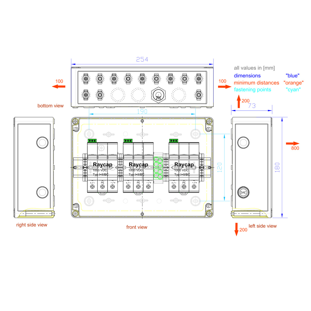 Bemessungsisolierspannung (Ui) : 1000VDC Bemessungsberiebsspannung (Ue): 1000VDC Strang Bemessungsstrom (Inc): 32A Bemessungsstrom (In): 32A(je MPP) Strang Auslegungsstrom* (Isc max =Isc stc x 1,25) =40A Auslegungsstrom* (Isc max =SIsc stc x 1,25) = 40A (je MPP) Anzahl der Strings IN: 1 je MPP je Potenzial Anzahl der Strings OUT: 1 je MPP je Potenzial Multi-MPP 3 Umgebungstemperatur: -25°C - +35°C (kurzzeitig 40°C) Überspannungsschutz: Klasse I+II/ BC Sicherungshalter: - Sicherung: - Lasttrennstelle: - Eingangsklemmen: MC - 4 Original Ausgangsklemmen: MC - 4 Original Schutzklasse: II IP Schutzart: IP65/PC Konformität: IEC 61439-1/2 Art der Montage: Wandmontage Abmessungen:(BxHxT)mm 254x180x111 Gehäuseversion: Polycarbonat (PC) Gehäuse mit transparentem Schraubdeckel geeignet für die Montage im Innenbereich oder geschützten Außenbereich Verschraubungen Erde: 1x M20 (d= 6,0-13,0) Druckausgleichselement 1x M12 * der Auslegungsstrom ISC MAX lt. VDE 0100-712:2016-10 beinhaltet den Faktor 1,25 für ISC STC des PV-Moduls, bzw. des PV-Stranges