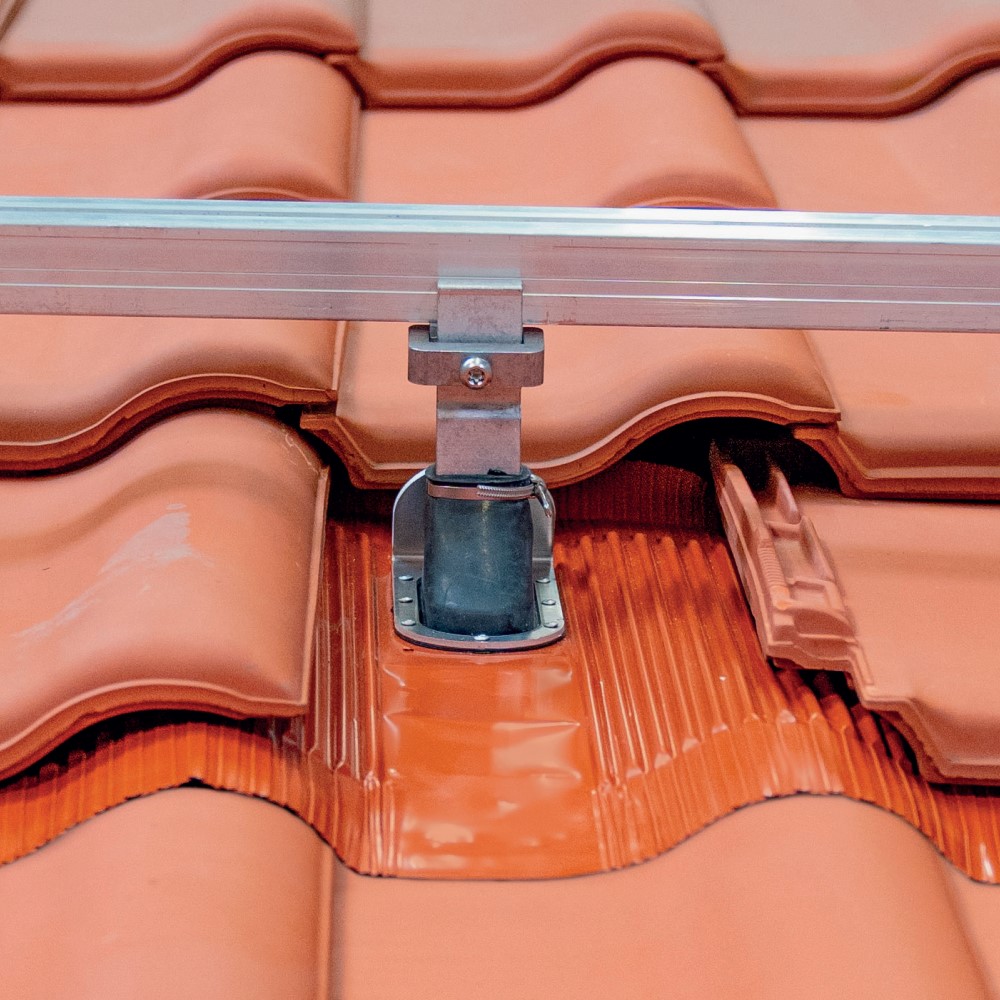 Die Ersatzplatte aus gewalztem Aluminiumblech passt sich ideal an den vorhandenen Ziegel an. Das Ausflexen der Ziegel entfällt daher. Eine Gummimanschette aus UV-beständigem EPDM und hochgekantete Plattenseiten sorgen für die Abdichtung. - Installation der Schienen hotizontal und vertikal (alternative Klemmkombinatin vertikal nötig) möglich