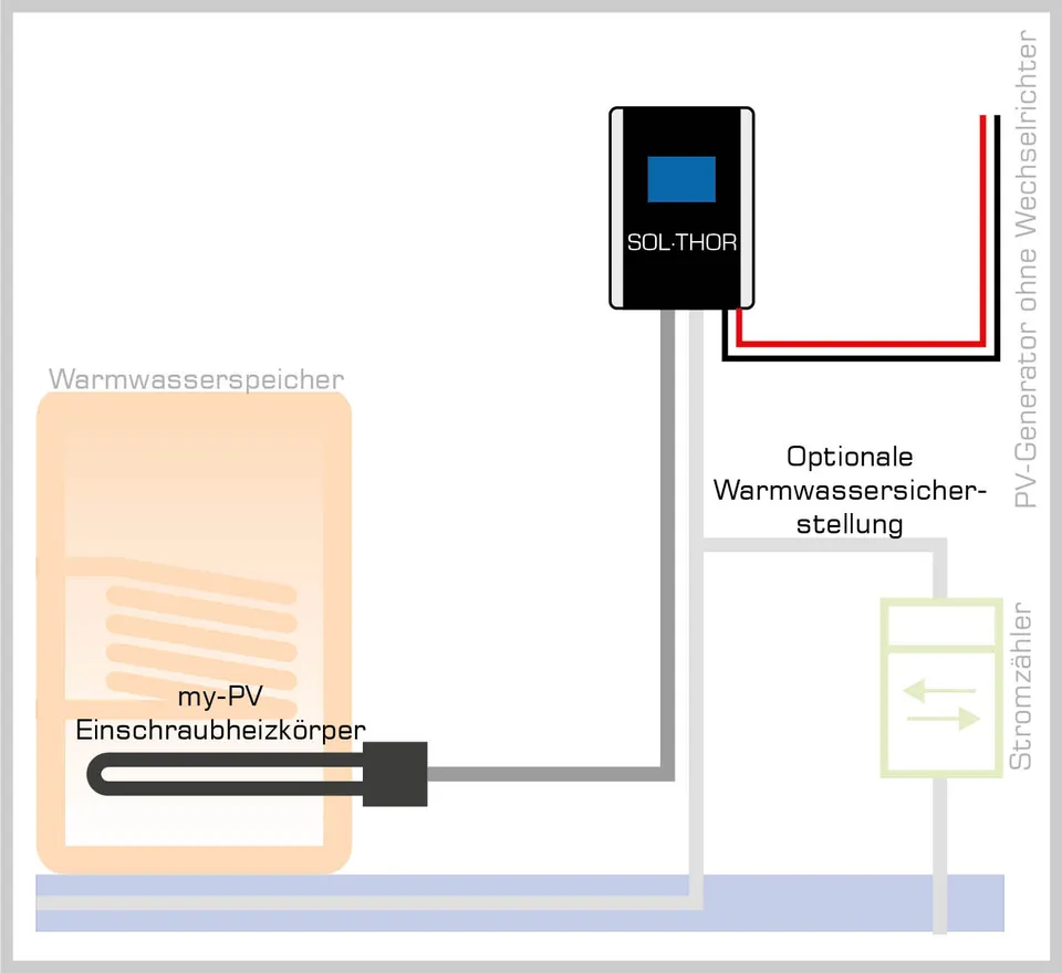Neben der Verwendung des my-PV Einschraubheizkörpers können auch herkömmliche Elektroboiler durch den SOL•THOR geregelt werden. Somit werden Elektroboiler durch die stufenlose Regelung des DC Power-Managers von my-PV photovoltaiktauglich – für maximalen Ertrag an Wärme aus Photovoltaikstrom.