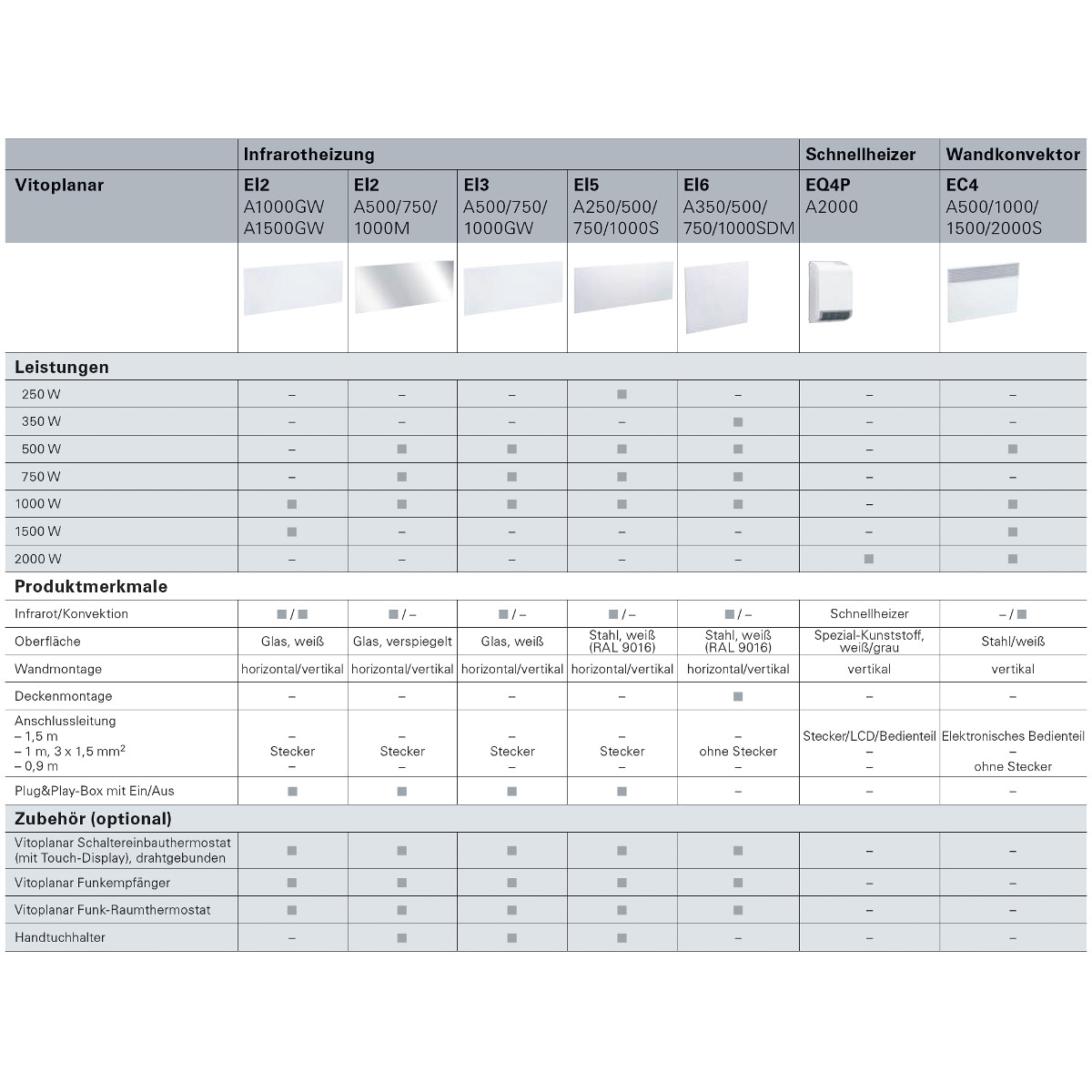 Viessmann Vitoplanar EI3 - aus Glas, mit Stecker - Infrarotheizung zur Wandmontage, Nenn-Wärmeleistung 500 bis 1000 W Infrarotstrahlungsheizung zur Wandmontage (horizontal oder vertikal) aus Glas weiß (6 mm starkes ESG Sicherheitsglas) Mit sehr hoher Strahlungswirkung und homogener Oberflächentemperatur Maximale Abstrahlung nach vorne bzw. nach unten durch optimal wärmegedämmte Rückseite (40 Grad C) 2 Temperaturbegrenzer für maximale Sicherheit Mit Anschlussleitung 3 x 1,5 qmm (1 m lang, mit 230V Schukostecker) Wartungs- und magnetfeldfrei Anschluss eines Funkempfängers mit Funkthermostat oder eines drahtgebundenen Raumthermostaten mit Touchdisplay möglich (Zubehör).   TypEI3 A500GW  TypEI3 A750GW  TypEI3 A1000GW    Nennleistung: 500  750  1000   Watt max. Temperatur: 95  95  95   Grad Celsius Heizfläche: 0,57  0,82   1,01   qm Höhe: 630  630  630   mm Länge: 900   1300  1600   mm Tiefe:  61  61  61   mm Gewicht: 15  23  33   kg Schutzart: IPX4  IPX4  IPX4    Schutzklasse: I  I  I    Nennspannung: 230  230  230   V   Elektrische Flächenheizungen bieten eine Vielzahl von Anwendungen: Etwa im Badezimmer in der Übergangszeit, wenn es sich noch nicht lohnt, die Heizung aufzudrehen. Oder im Wintergarten und in der Garage, die gerne auch mal als Hobbywerkstatt zweckentfremdet wird. Sie bieten sich zur Sanierung im Altbau genauso wie im Neubau an. Dort eignen sie sich sogar bei entsprechendem Dämmgrad der Gebäudehülle als sparsame Vollheizung. Angenehme Infrarotwärme Vielen Menschen ist die Infrarotstrahlung aus der medizinischen Anwendung bestens bekannt. Vor einer Massage wärmt sie den Körper angenehm auf. Und im Haushalt werden Infrarotlampen gerne zur Linderung einer Erkältung benutzt. Mit dieser Strahlungswärme kann aber auch geheizt werden. Die dafür entwickelten Flächen heizungen erzeugen ihre volle Wirkung, wenn die Infrarotstrahlung auf Gegenstände und Menschen im Haus trifft. Diese Energie wird dann ihrerseits wieder gleichmäßig an den Wohnraum abgegeben. Wirtschaftliche Modernisierung Infrarotheizungen können vielfach die Alternative zum klassischen Heizkörper sein. Bei der Sanierung ist etwa der Austausch veralteter Nachtspeicheröfen – jüngere Zahlen nennen eine halbe Million Öfen – gegen die modernen, flachen Infrarotheizungen eine besonders wirtschaftliche Lösung. Der Stromanschluss ist bereits vorhanden und die aufwändige Installation von Heizungsrohren, der Hausanschluss für Erdgas und die Investition in ein konventionelles Heizsystem entfällt. Vollheizung im Neubau Im Neubau kann die Infrarotheizung eine sinnvolle Ergänzung zur Wärmepumpe oder einem Gas-Brennwertgerät sein. In gut gedämmten Häusern ist auch der Einsatz als Vollheizung möglich. Vitoplanar von Viessmann Vitoplanar Systeme sind effizient und sicher. Dazu zählen die gleichbleibend hohe Strahlungswirkung, zwei Temperaturbegrenzer für beste Sicherheit, hoch gedämmte Rückseiten für maximale Abstrahlung, wartungs- und magnetfeldfreie Technik und nicht zuletzt flexible Montagemöglichkeiten. Ein ausführliches Datenblatt und Produktflyer der Viessmann Vitoplanar können Sie unten downloaden