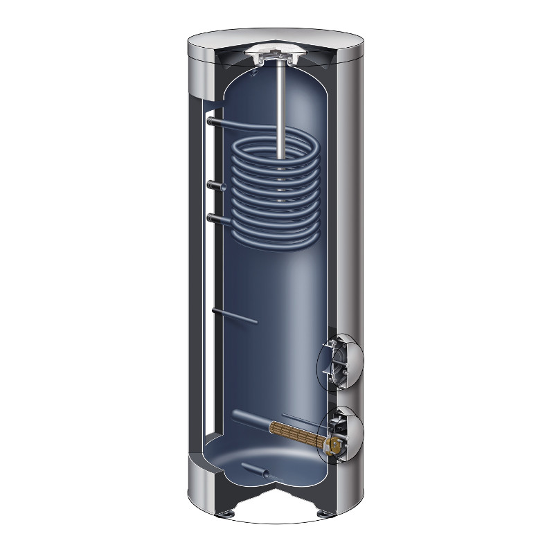 - Aufheizung des gesamten Wasserinhalts über tief bis zum Speicherboden geführte Heizwendel.